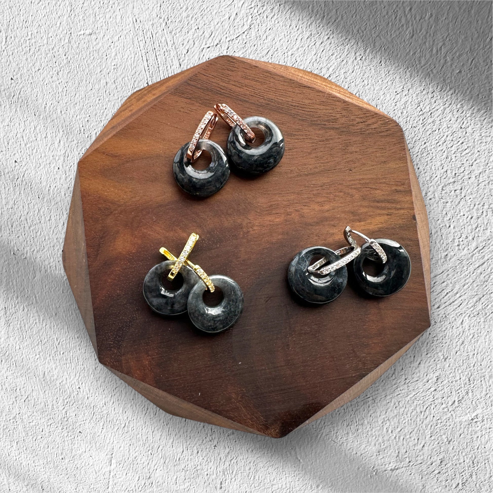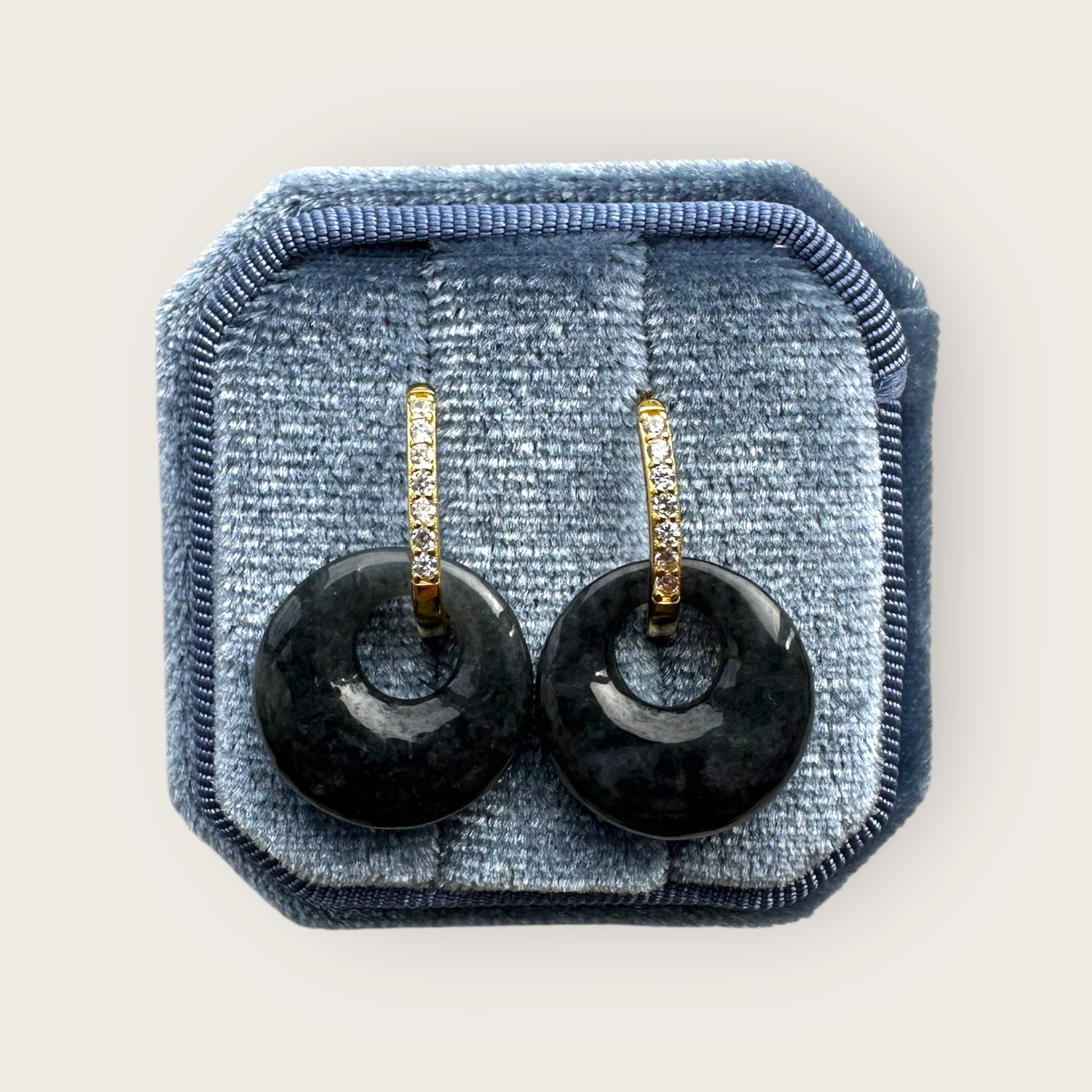Elegant and modern, these huggie earrings feature rare Black Wuji jadeite paired with sparkling princess-cut accents. The deep, inky jade symbolizes strength and protection, while the snug huggie design ensures all-day comfort and effortless style. Perfect for adding a touch of timeless sophistication to any look.