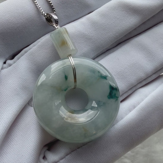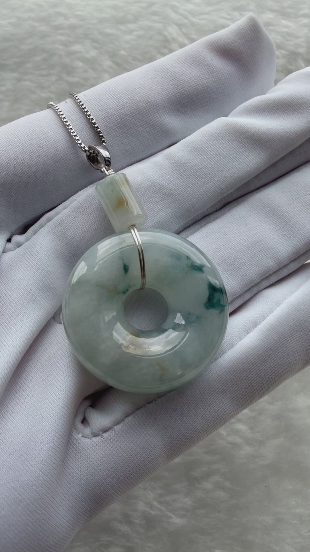 A serene blend of elegance and tradition, featuring an icy-blue jadeite pendant with soft, cloud-like floral patterns drifting within the stone. Symbolizing harmony and completeness, the donut shape is a timeless piece that brings calm sophistication to everyday wear.