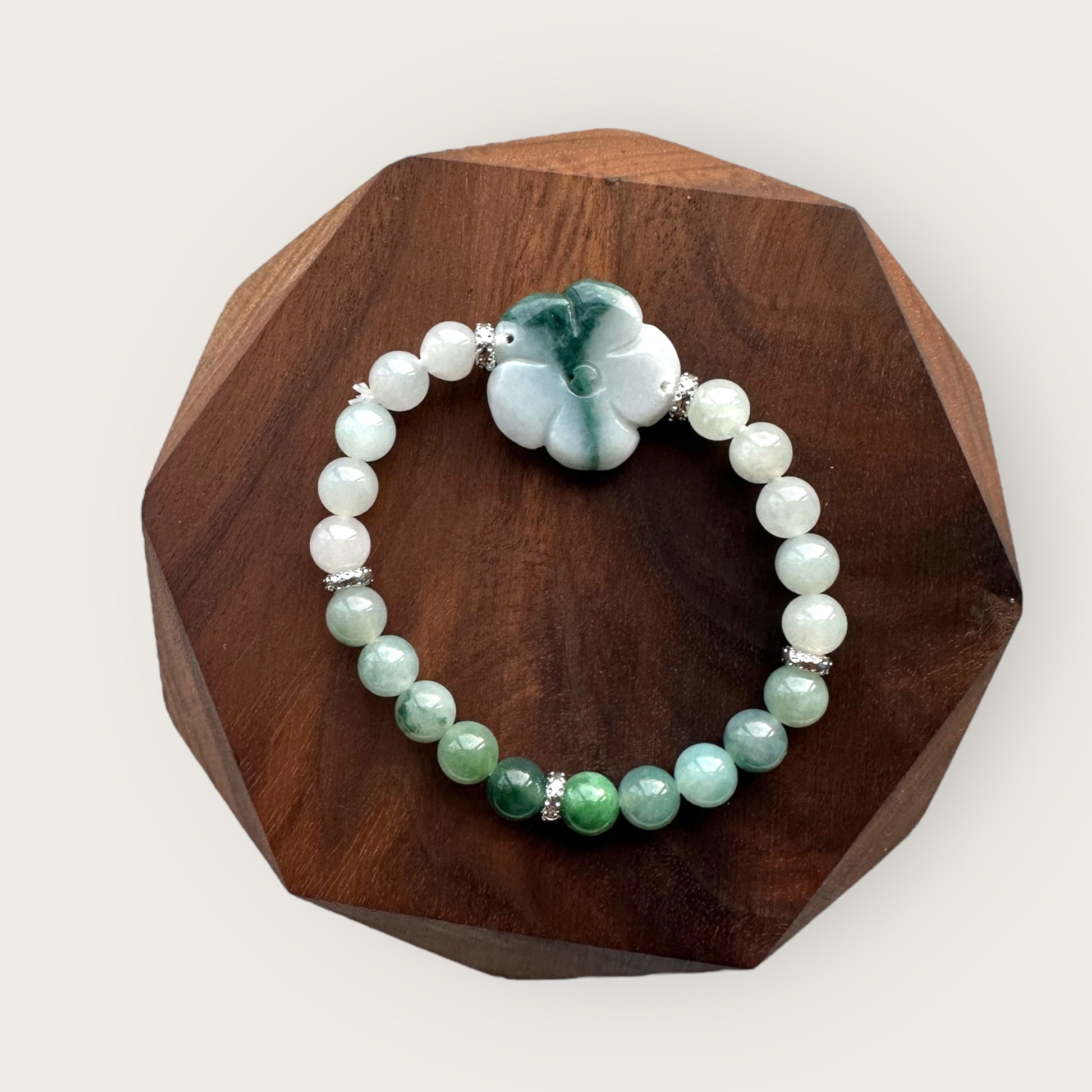 Soft and feminine, this bracelet features natural Type A rose jadeite with a perfect splash of white and green, matching the rest of the jadeite beads. Perfect for adding a touch of elegance to your everyday style.