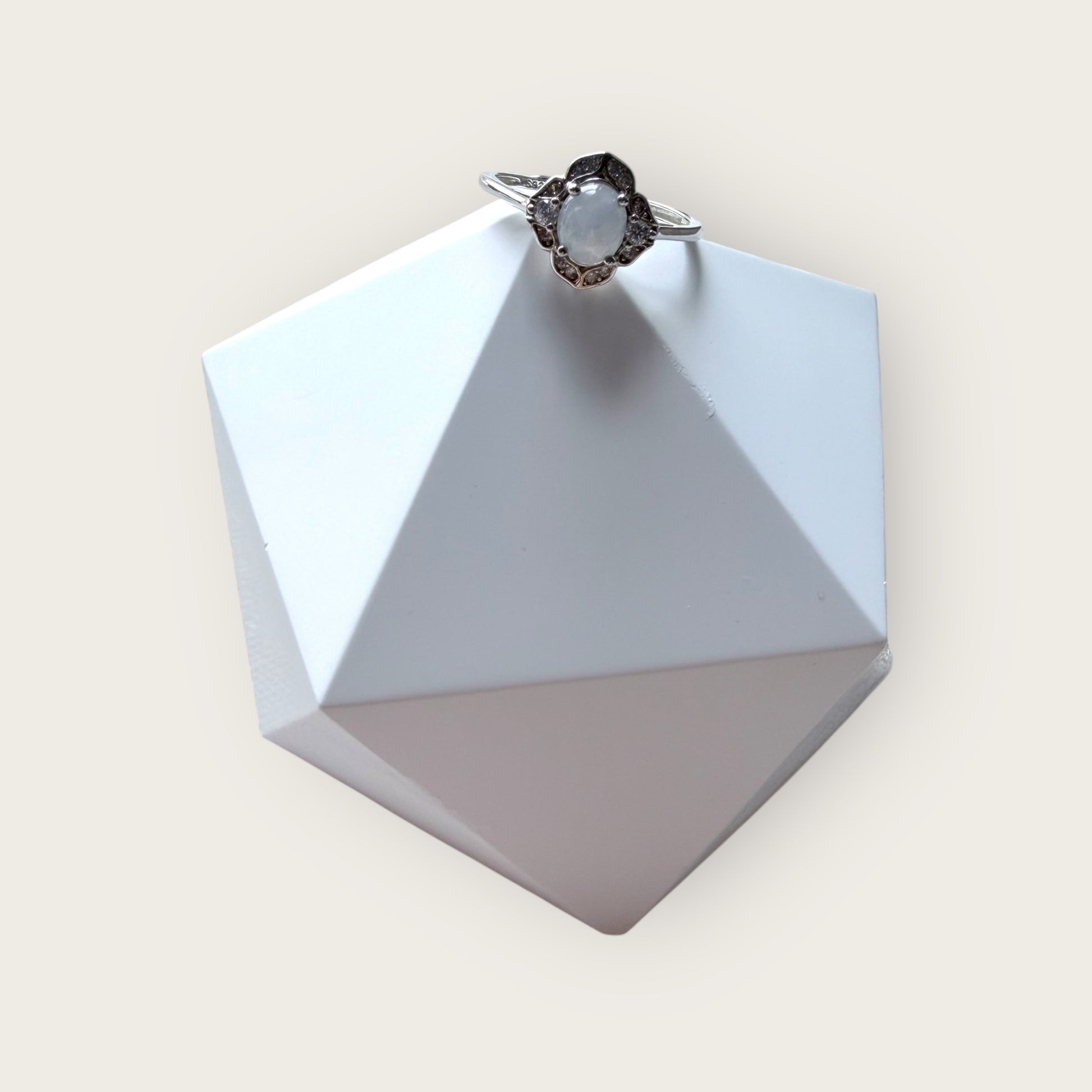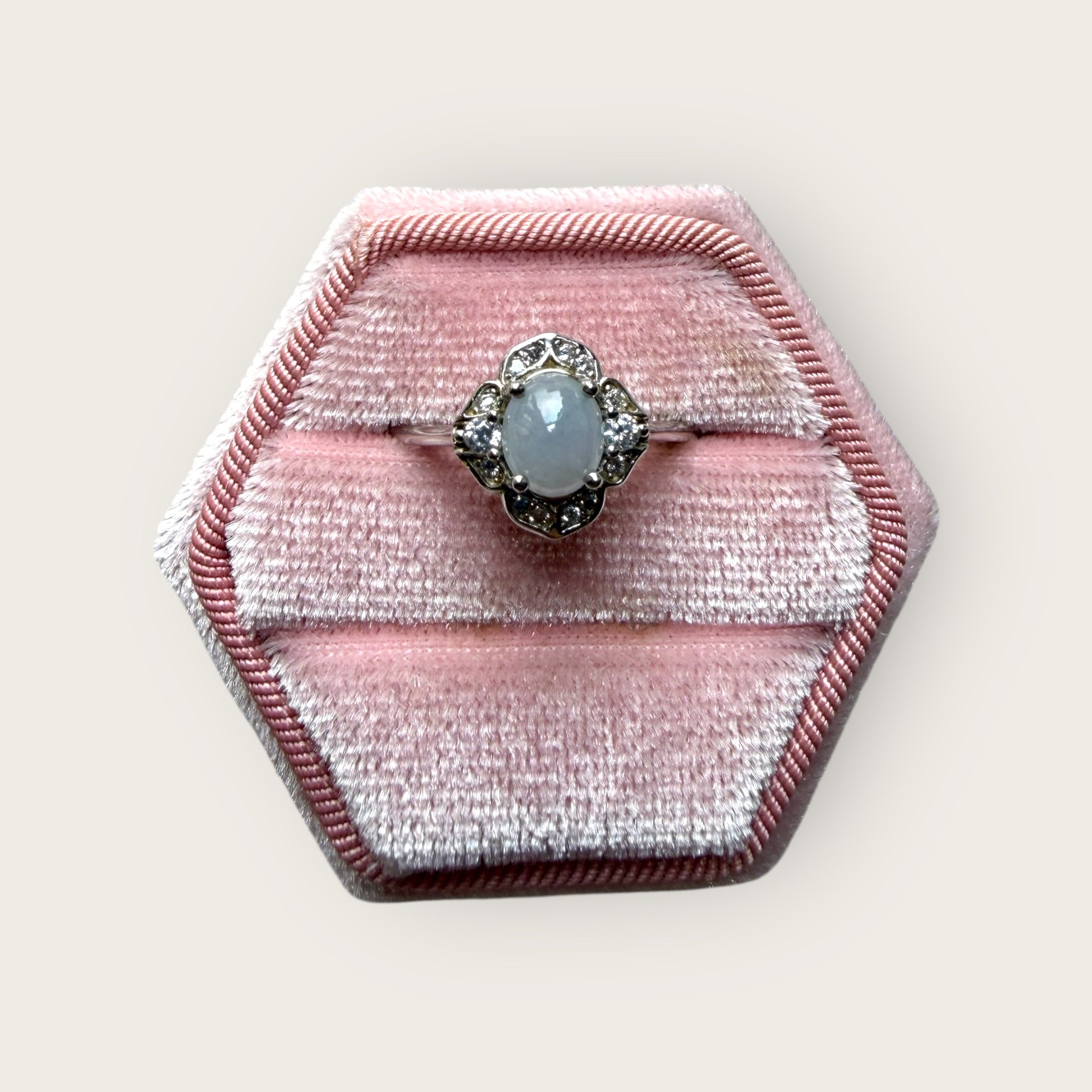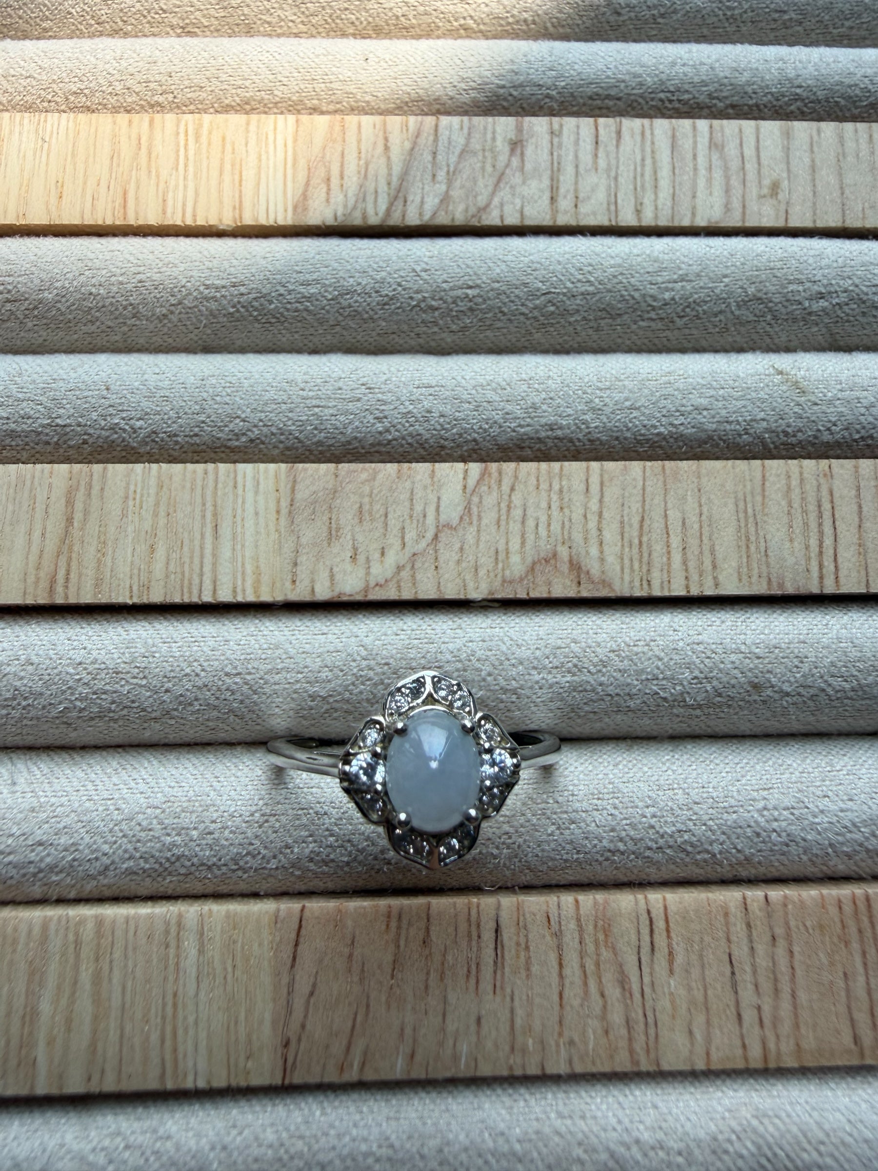 Featuring a smooth, polished jadeite gem in purple hues on simple flower silver settings, making it a timeless piece of elegant, inner peace and wisdom.