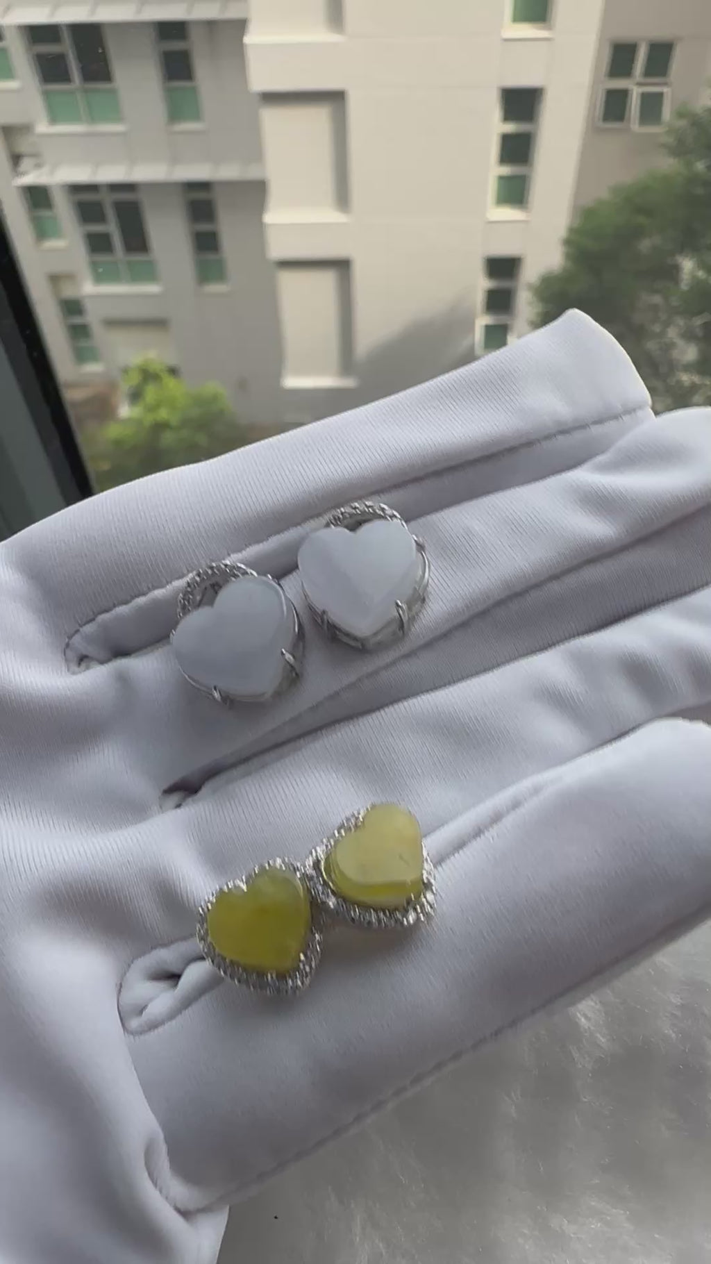 - Fall in love with these sweet and meaningful jadeite heart earrings — a perfect harmony of purple (peace, spiritual growth) and yellow (joy, clarity).